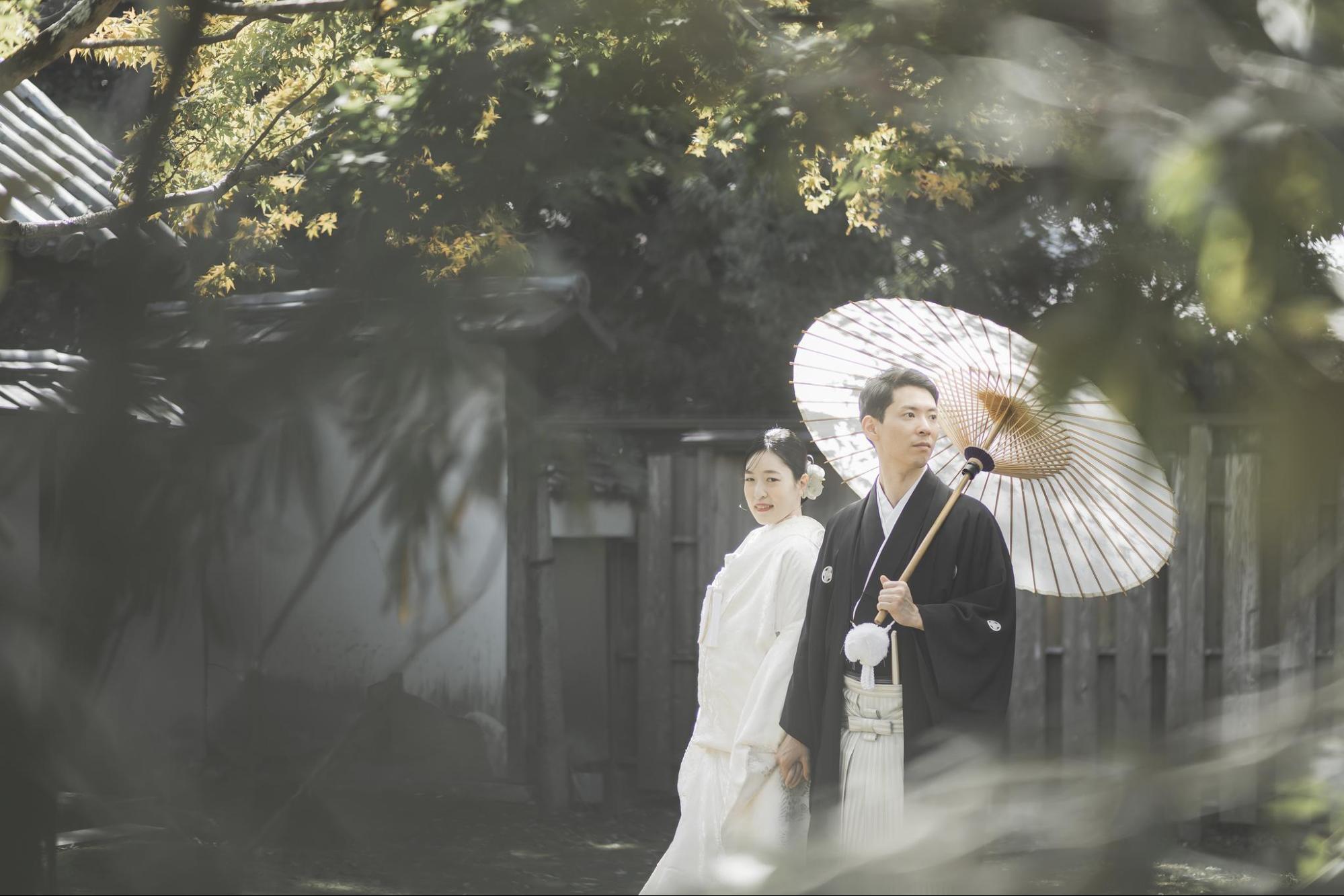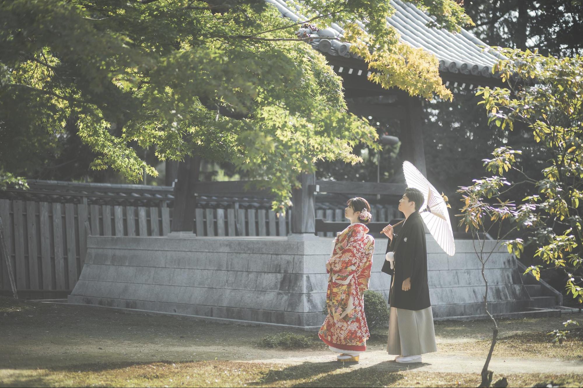 和装の前撮りでは、撮影場所にはこだわることをおすすめします。なぜなら、和装の魅力を最大限に引き出すのは、撮影する場所の雰囲気だからです。神社や日本庭園などのロケーションで撮影すれば、和装がより映え、非日常感あふれる写真が残せます。