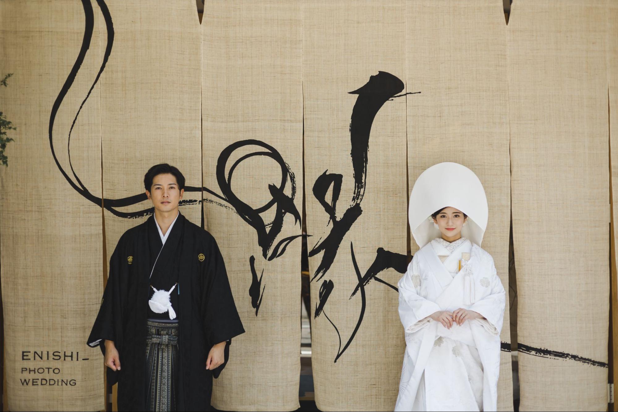 ENISHIの象徴である「縁」という暖簾は、「過去」と「未来」が【縁】で交わり未来へ長く続いていくようにという思いが込められて作られています。特別な瞬間をより濃く特別な写真に残せるように全ての撮影プランに暖簾前撮影を含めています。