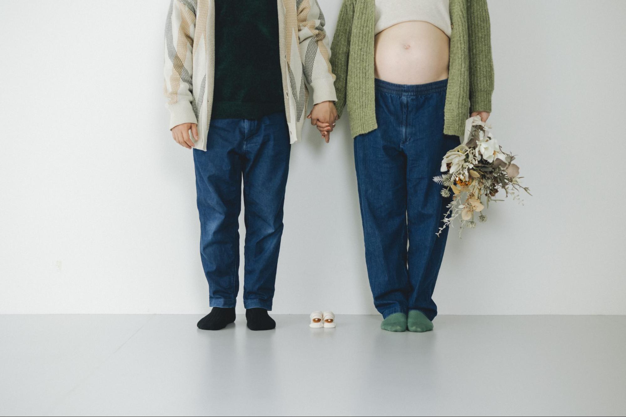 購入済みのベビー服やファーストシューズを一緒に撮影すると、赤ちゃんのサイズ感や愛らしさが引き立ちます。小さな靴を2人の足元に並べたり、ベビー服をハンガーにかけて2人の間に持ったりする構図が人気です。新しい家族の誕生を心待ちにしている親心が伝わる1枚になります。