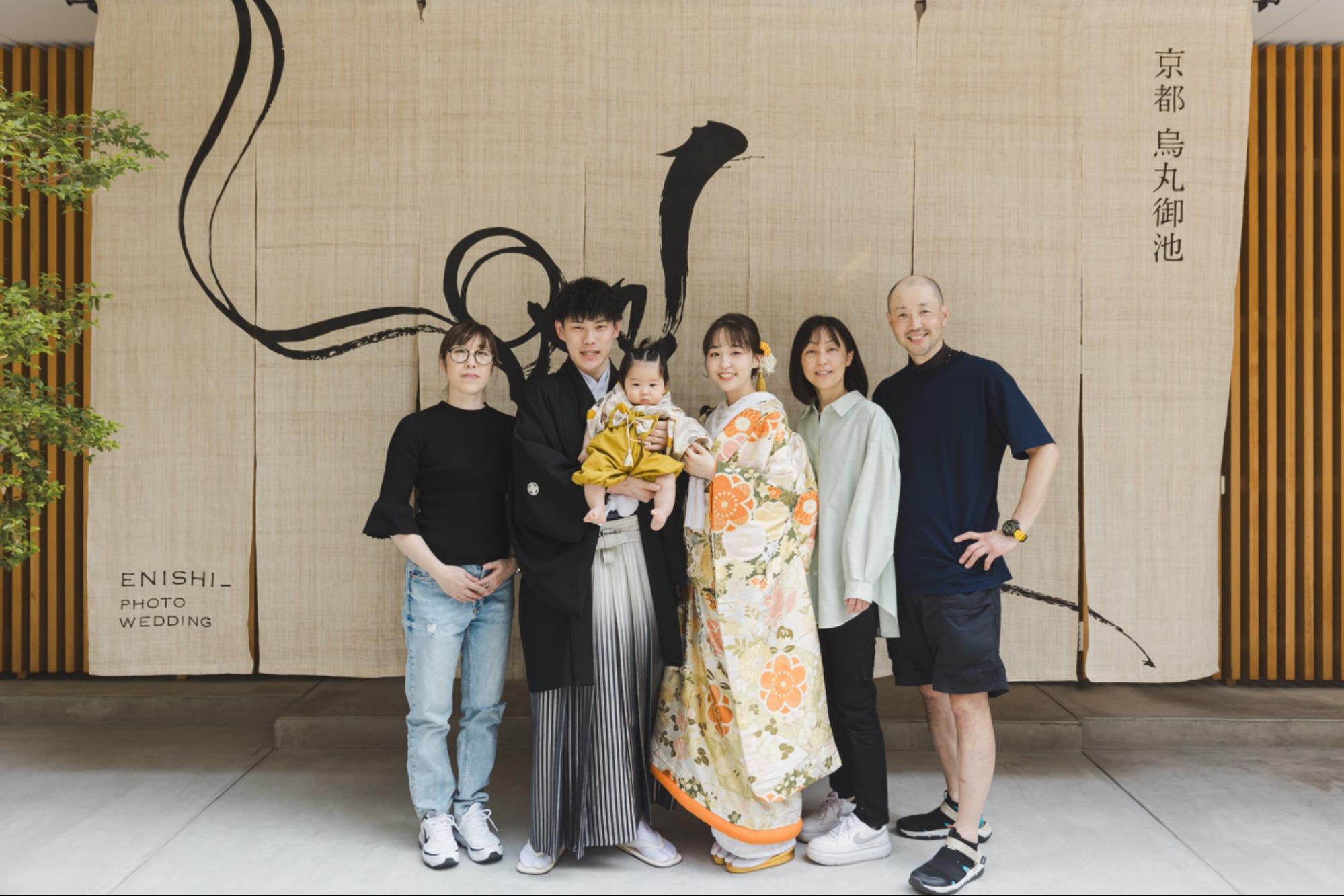 ENISHIの象徴である「縁」という暖簾は、「過去」と「未来」が【縁】で交わり未来へ長く続いていくようにという思いが込められて作られています。特別な瞬間をより濃く特別な写真に残せるように全ての撮影プランに暖簾前撮影を含めています。