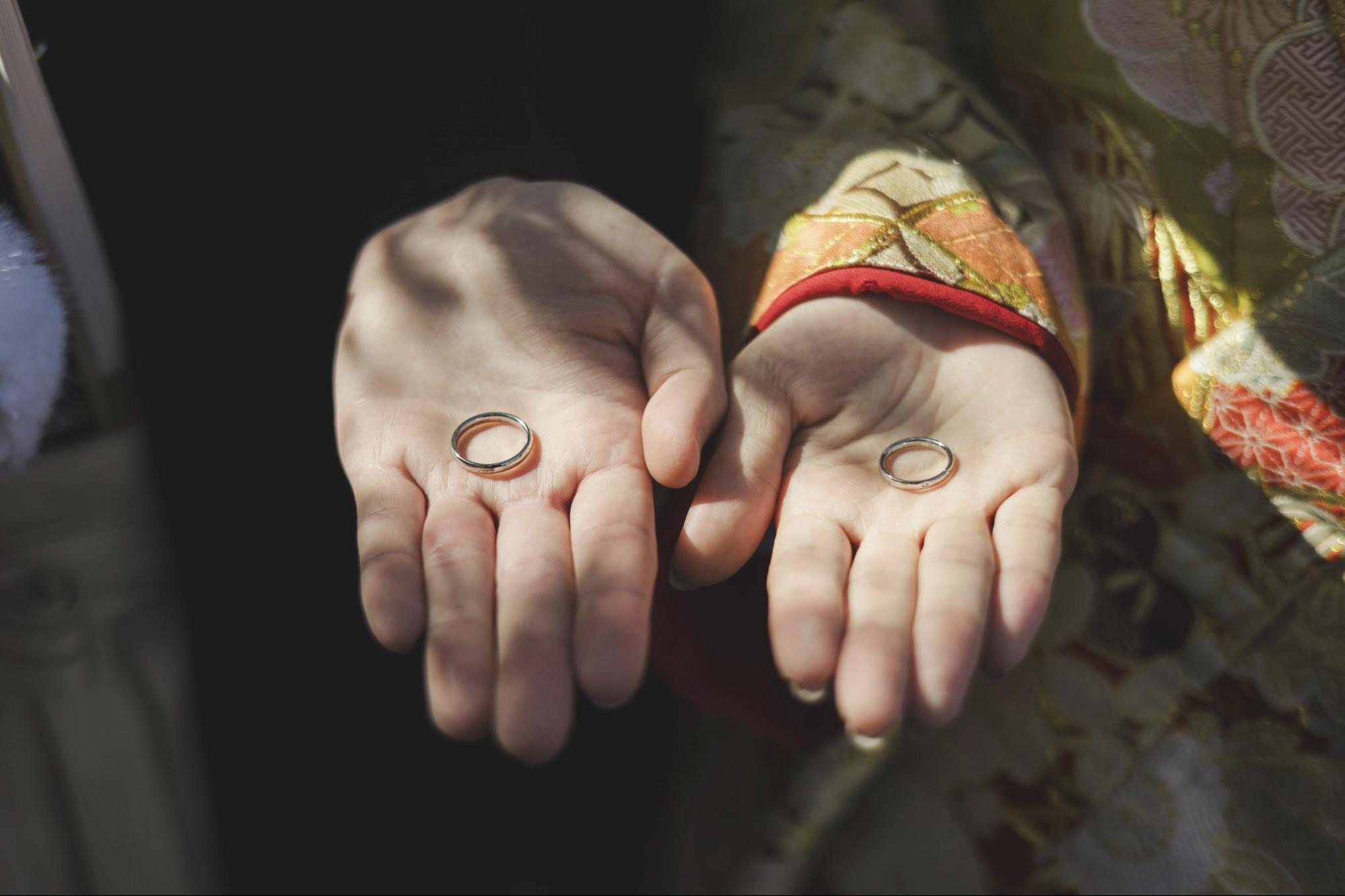 結婚の象徴である指輪は、前撮りでも欠かせないアイテムです。手元をアップで撮影することで、2人の誓いの象徴として印象的な写真を残せます。また、指輪ケースを用いた演出も人気です。特に、洋装ではプロポーズシーンを再現するなど、ロマンチックな雰囲気に仕上がります。撮影時に持ち込むだけなので、手軽に準備できます。