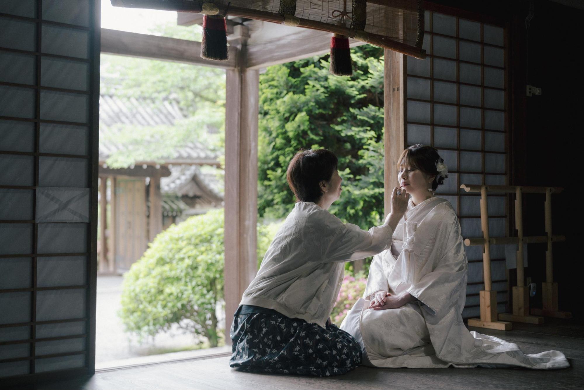 リップを塗る瞬間や、チークをのせるシーンを撮影に取り入れることで、結婚式前の“支度”のワンシーンを切り取れます。あえてメイク途中のシーンを写しとることで、花嫁の美しさを引き立て、映画のワンカットのような演出が可能です。