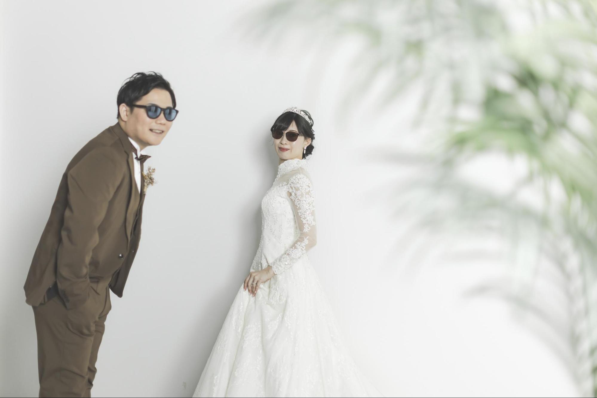 恥ずかしがる妻には、小物を活用したポーズがおすすめです。たとえば、ブーケで口元を隠したり帽子やサングラスで視線を覆ったりして顔を隠してみてください。照れを軽減しながらおしゃれな仕上がりになります。