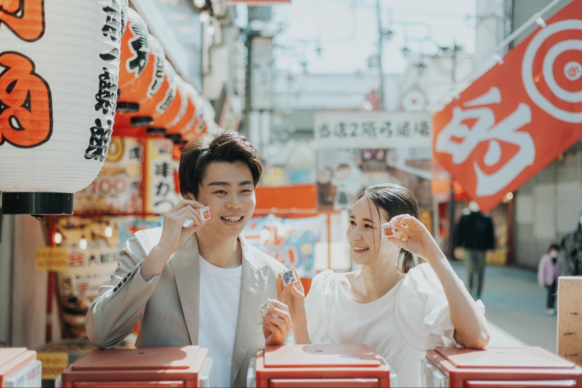 カメラ目線が苦手な人には、目線を外した自然なショットを多めに撮るのも効果的です。お互いを見つめ合ったり、歩いている瞬間を切り取ったりするだけでも、ナチュラルで雰囲気のある写真になります。