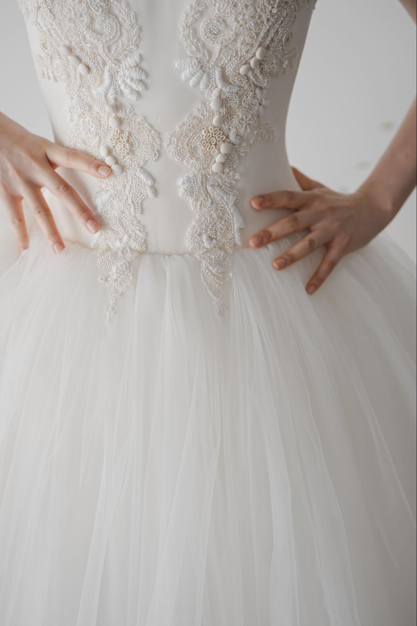 VIVIANEは、刺繍とビジューがほどこされたビスチェが目を引くウェディングドレスです。スカート部分はふんわりとした中にも優雅なレースが施され、華やかさと幻想的な美しさを両立させたバランスの良いデザインです。