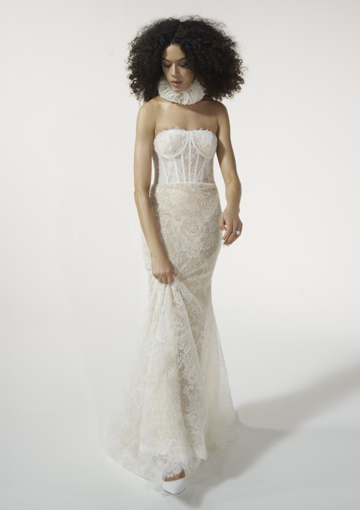 ORMANDAは、全体をレースで構成し、スレンダーなシルエットが印象を引き立てるウェディングドレスです。ボディラインを美しく見せるカッティングと、緩やかなトレーンが大人のエレガンスを演出します。屋外のロケーションフォトにも映えるドレスです。