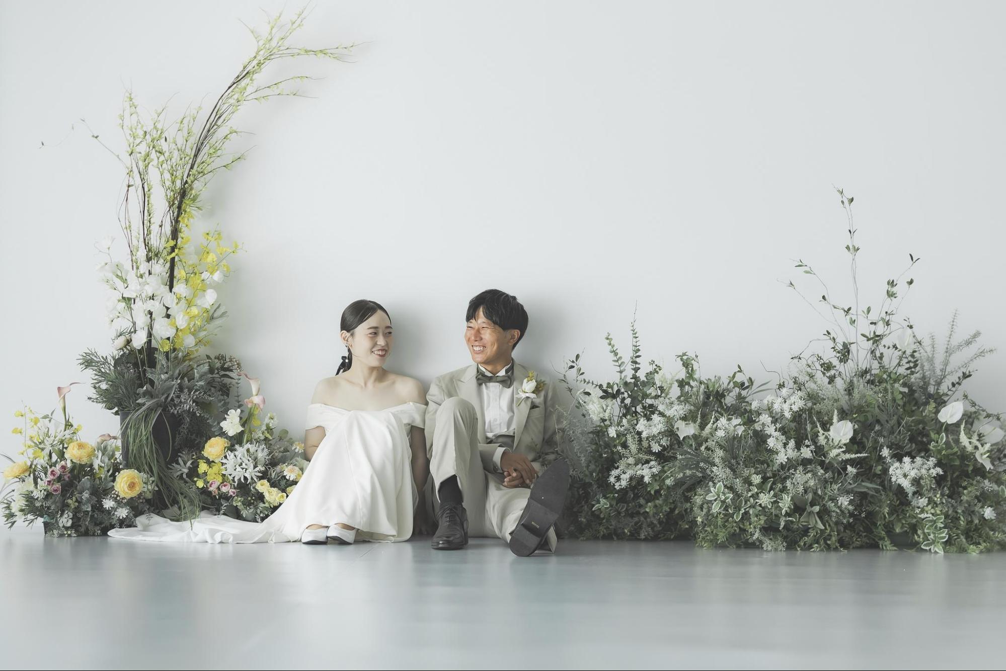 華やかなスタジオを使った笑顔あふれるショットは、入籍のお祝いの雰囲気を強調できます。背景紙やフラワーセット、照明を工夫することで、明るい雰囲気の演出が可能です。歩きながら笑う瞬間を連写すると、自然で華やかな表情が残せます。