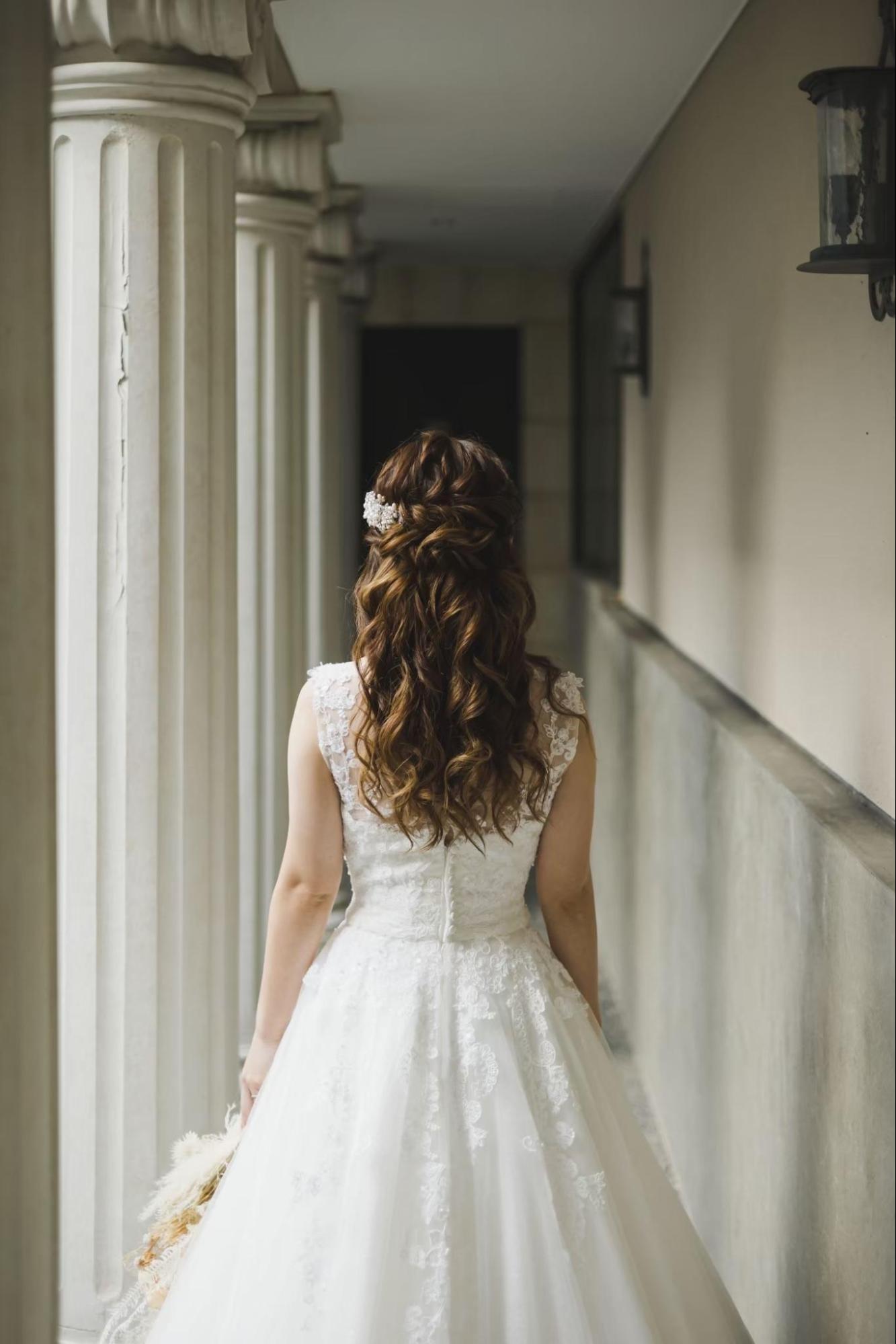 ロングヘアの花嫁に人気なのが、ハーフアップとウェーブスタイルです。下ろした髪の柔らかなウェーブが女性らしく、清楚な雰囲気を演出します。ティアラやリボンカチューシャを合わせると、プリンセスのような可憐さが際立ちます。また、ハーフアップは、ベールをつけてもシルエットが崩れにくく、披露宴から二次会まで対応できる点も魅力です。