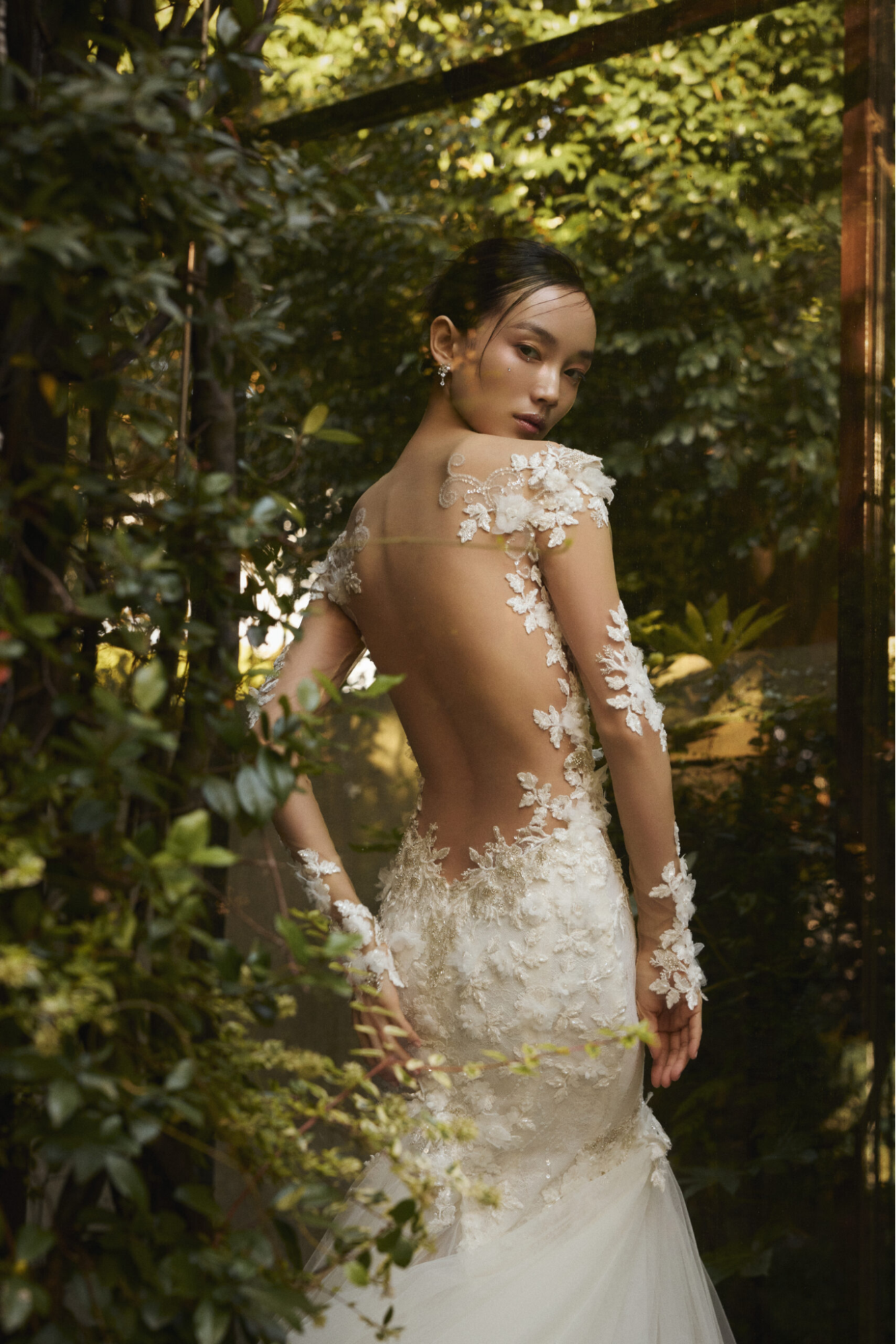 大胆に背中が開いたデザインでありながら、この高度な技術により高貴でセンシュアルな印象に昇華されています。チャペルの扉が開いた瞬間など、ゲストの視線を釘付けにする息をのむほど美しいバックスタイルは、ガリア・ラハヴならではの圧倒的な魅力です。