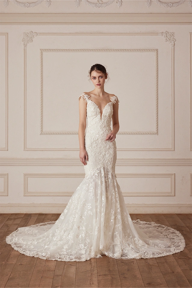 Sallyは、3Dフラワーが全身に咲き誇るロマンティックなドレスです。マーメイドラインとAラインの中間のような、比較的ゆったりとしたソフトマーメイドのシルエットで、体のラインを過度に強調しません。