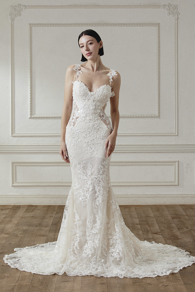 単に細いだけでなく、女性らしい丸みとメリハリを強調し、着る人の自信を引き出してくれるのがポイントです。膝上から裾にかけて広がるドラマティックなスカートとトレーンは、歩く姿さえも優雅に演出します。花嫁自身が内側から溢れ出るような輝きを放ちます。