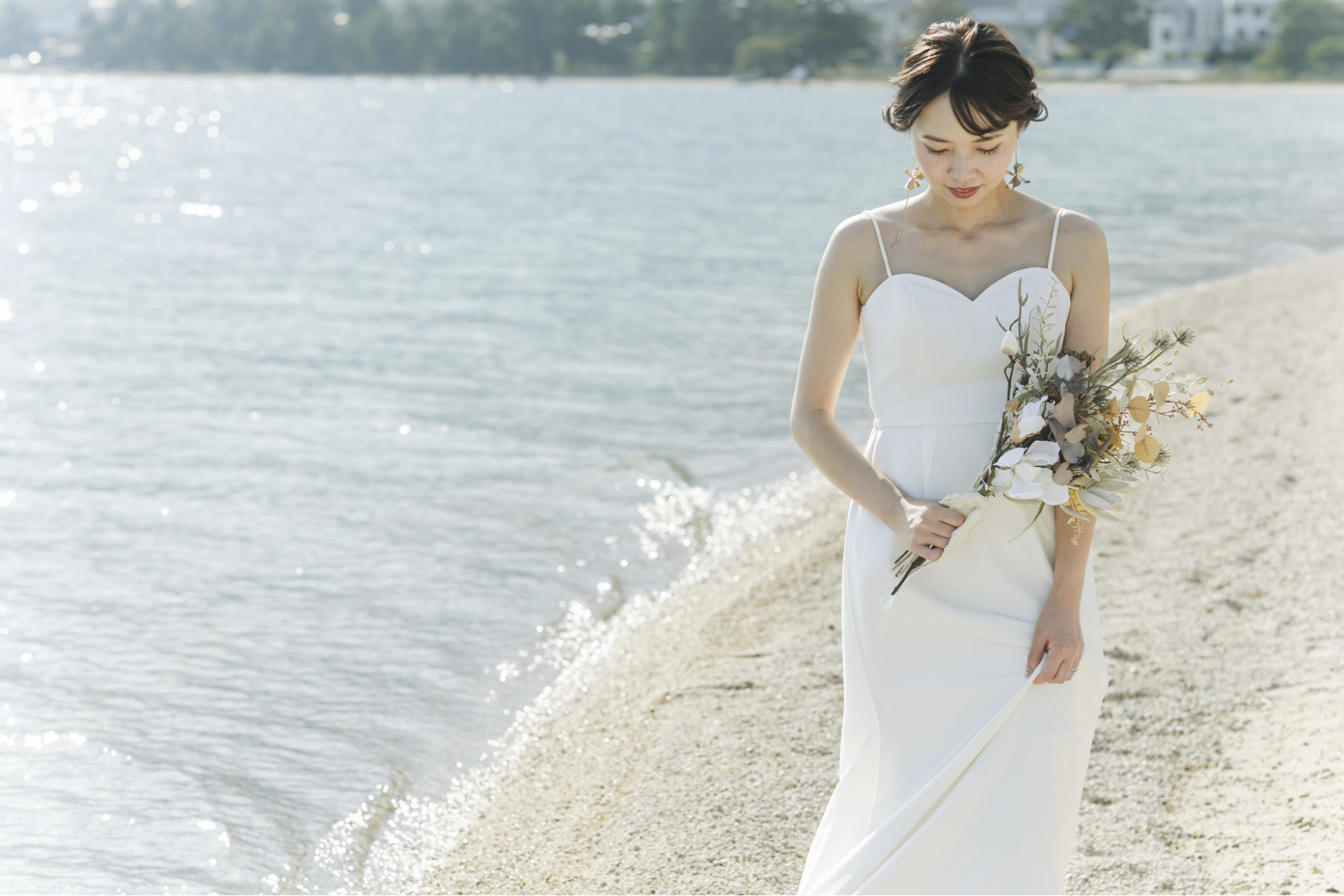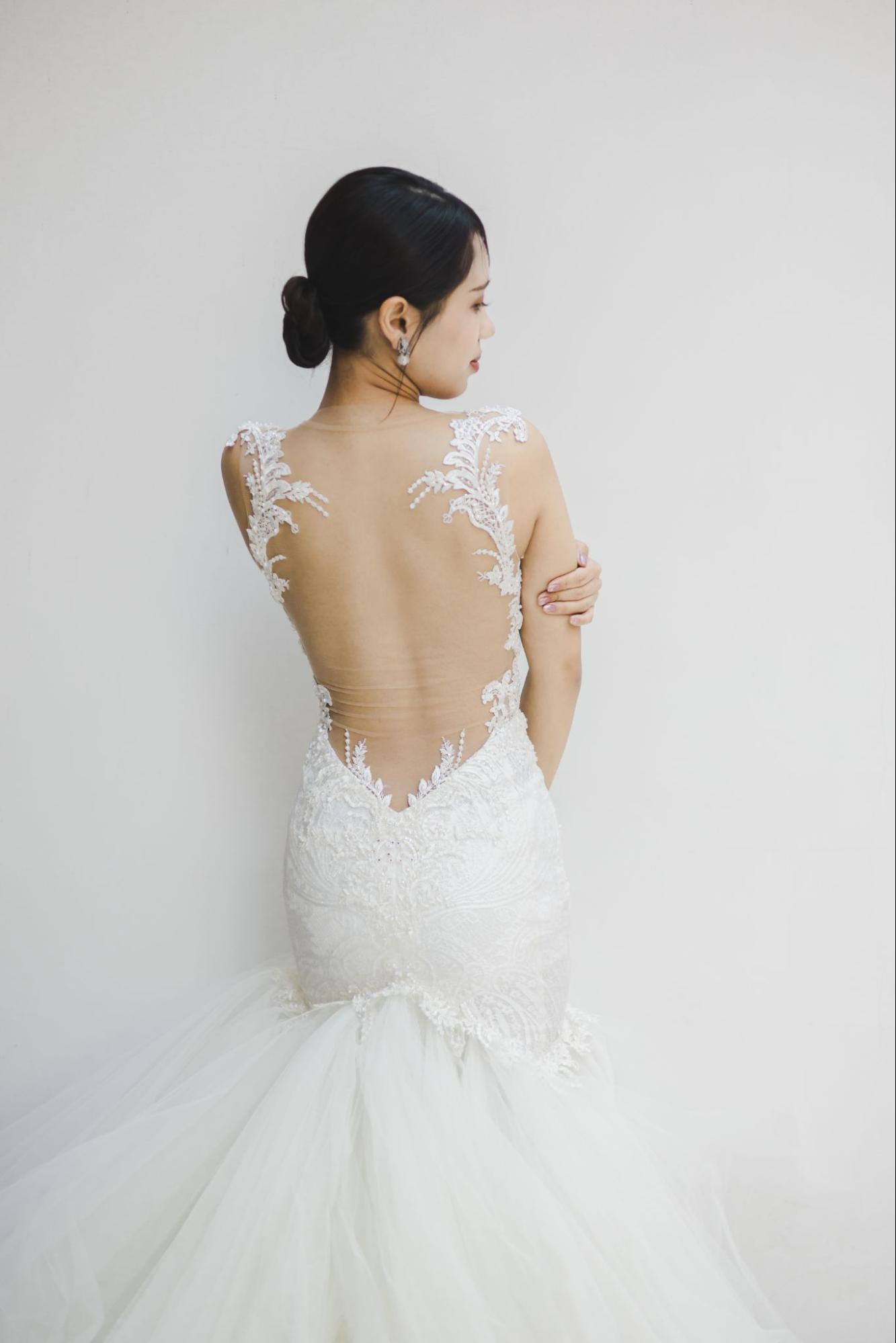開放的なイリュージョンバックのデザインは、リゾートウェディングや海辺でのフォトウェディングとも相性抜群です。