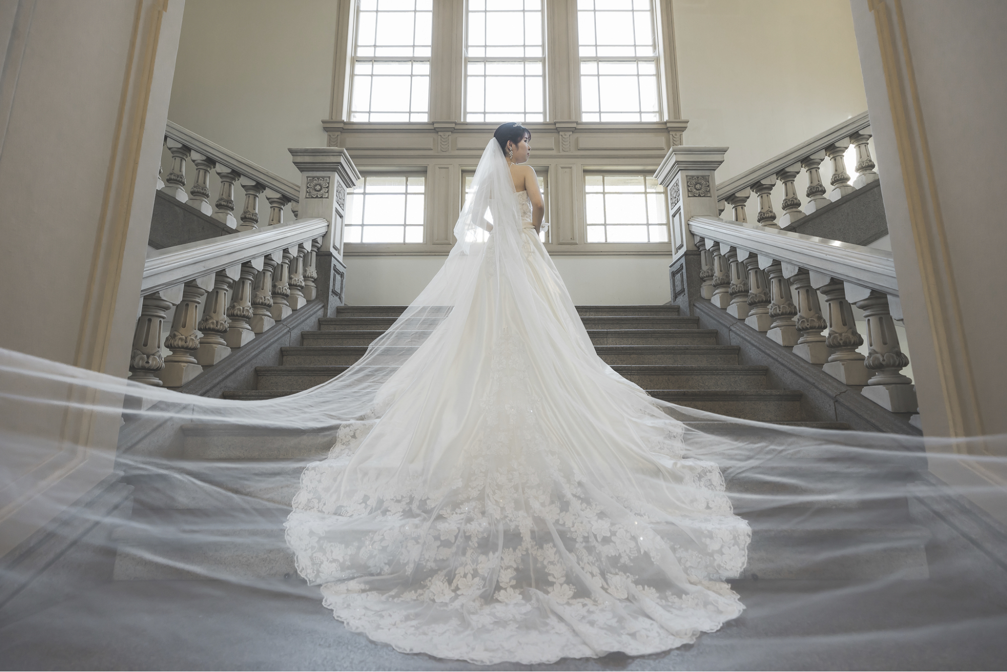 圧倒的な存在感を放つドレスだからこそ、その背景となるロケーション選びも重要です。 長いトレーンが映える大聖堂の長いバージンロードや大階段は、ガリア・ラハヴの鉄板ロケーションです。