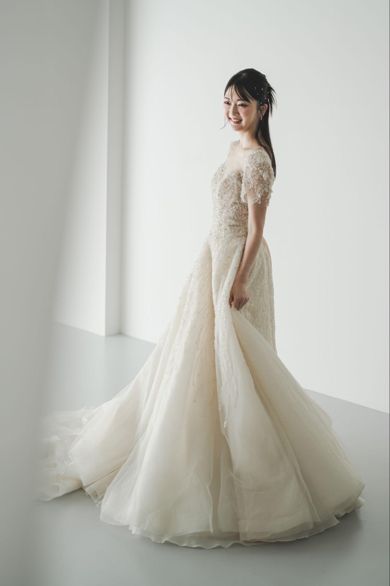 プリンセスラインやAラインのドレスでは、スカートのボリューム感も魅力の1つです。何層にも重ねられたチュールやオーガンジーが、歩くたびにふわふわと揺れ動き、夢のようなシルエットを作り出します。