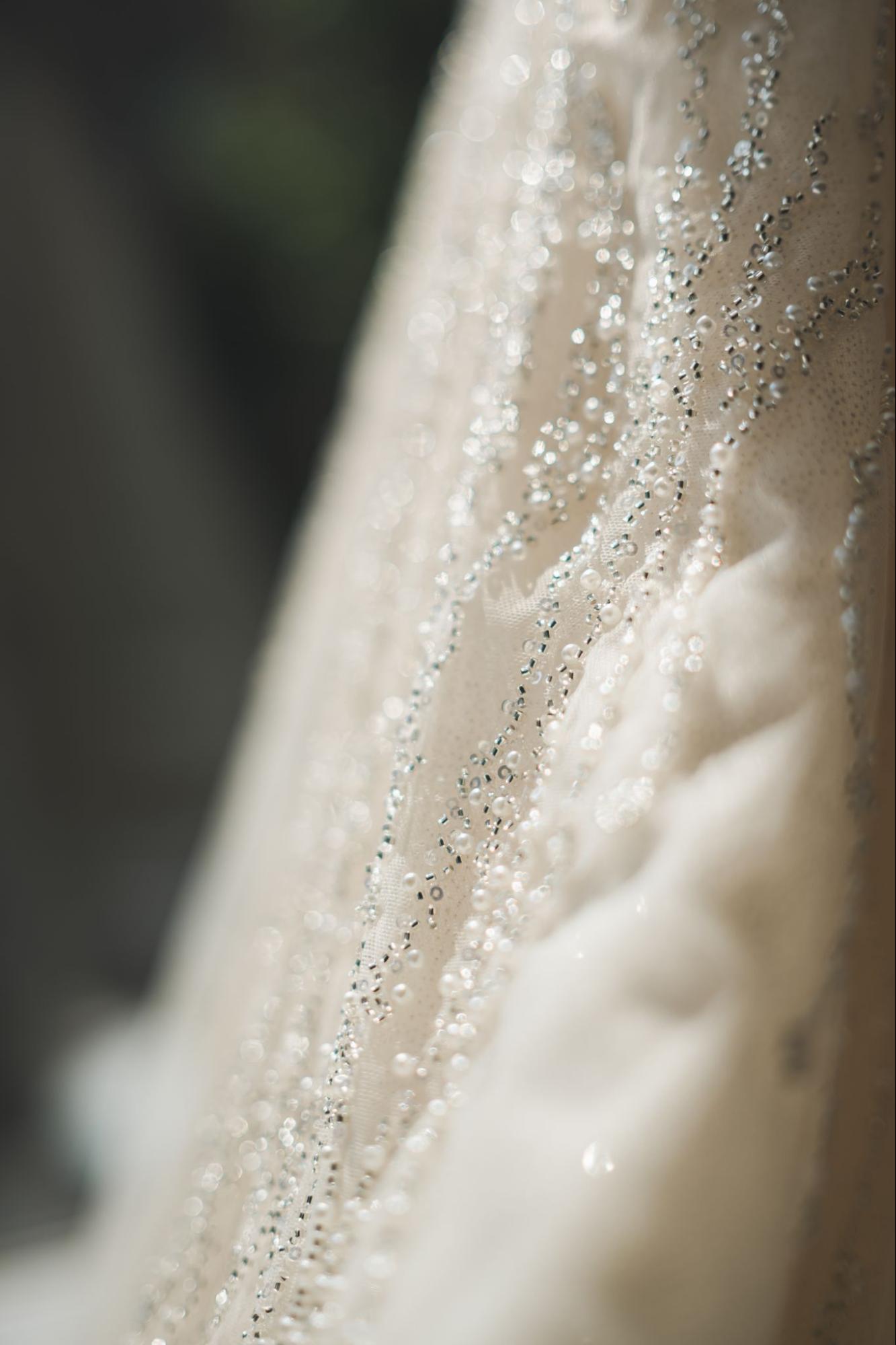 ドレスの表面にあしらわれたビーズやスパンコールは、光の当たり方で異なる表情を見せます。チャペルなどの厳かな照明の下では神秘的に輝き、自然光が降り注ぐ屋外や窓辺では透明感のある煌めきを放つのも特徴です。
