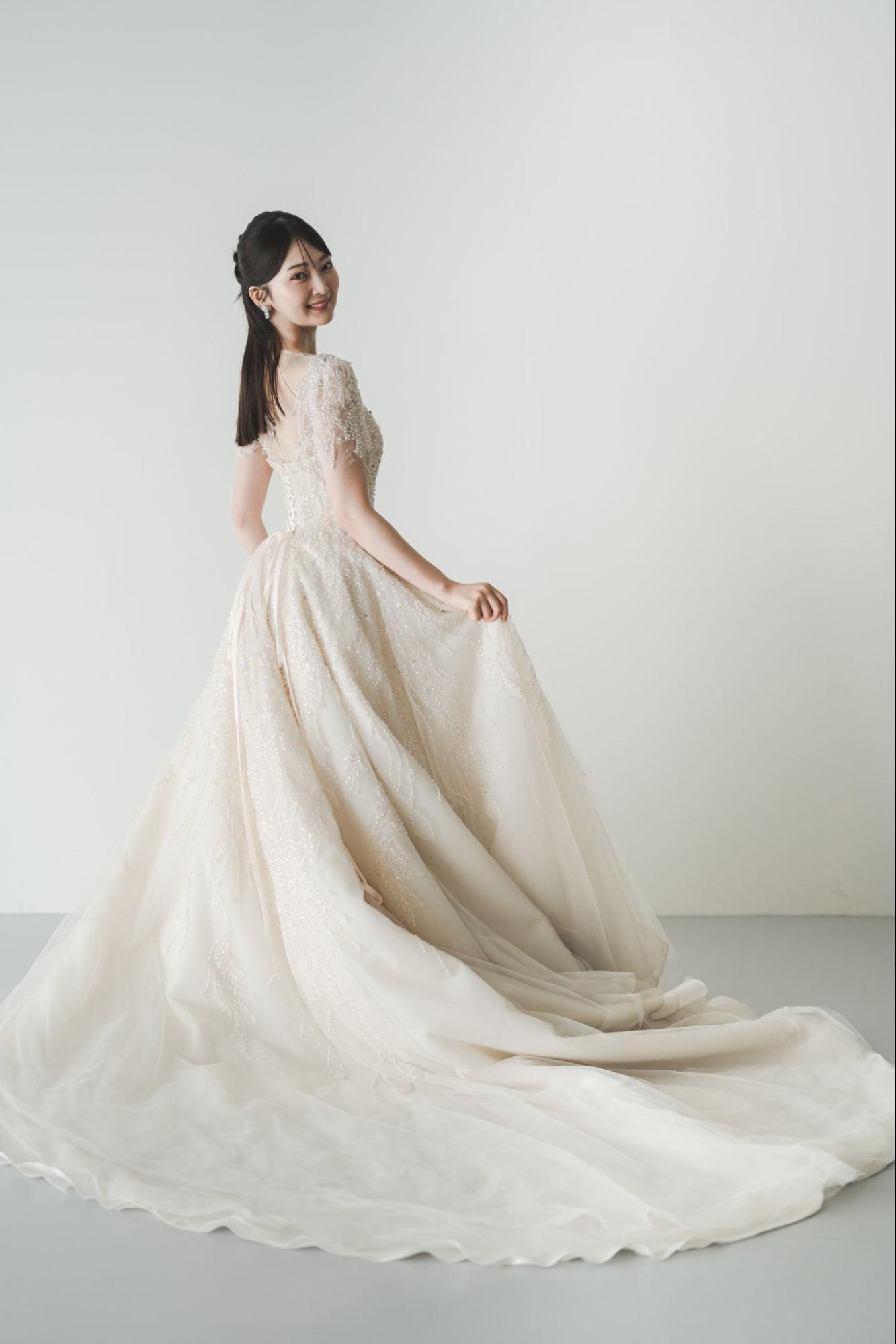 アジア人女性の体型を知り尽くしたパターンメイキングにより、体のラインを自然に美しく見せる工夫が施されています。計算されたシルエットは、写真映えを重視するフォトウェディングにおいて非常に大きなアドバンテージです。
