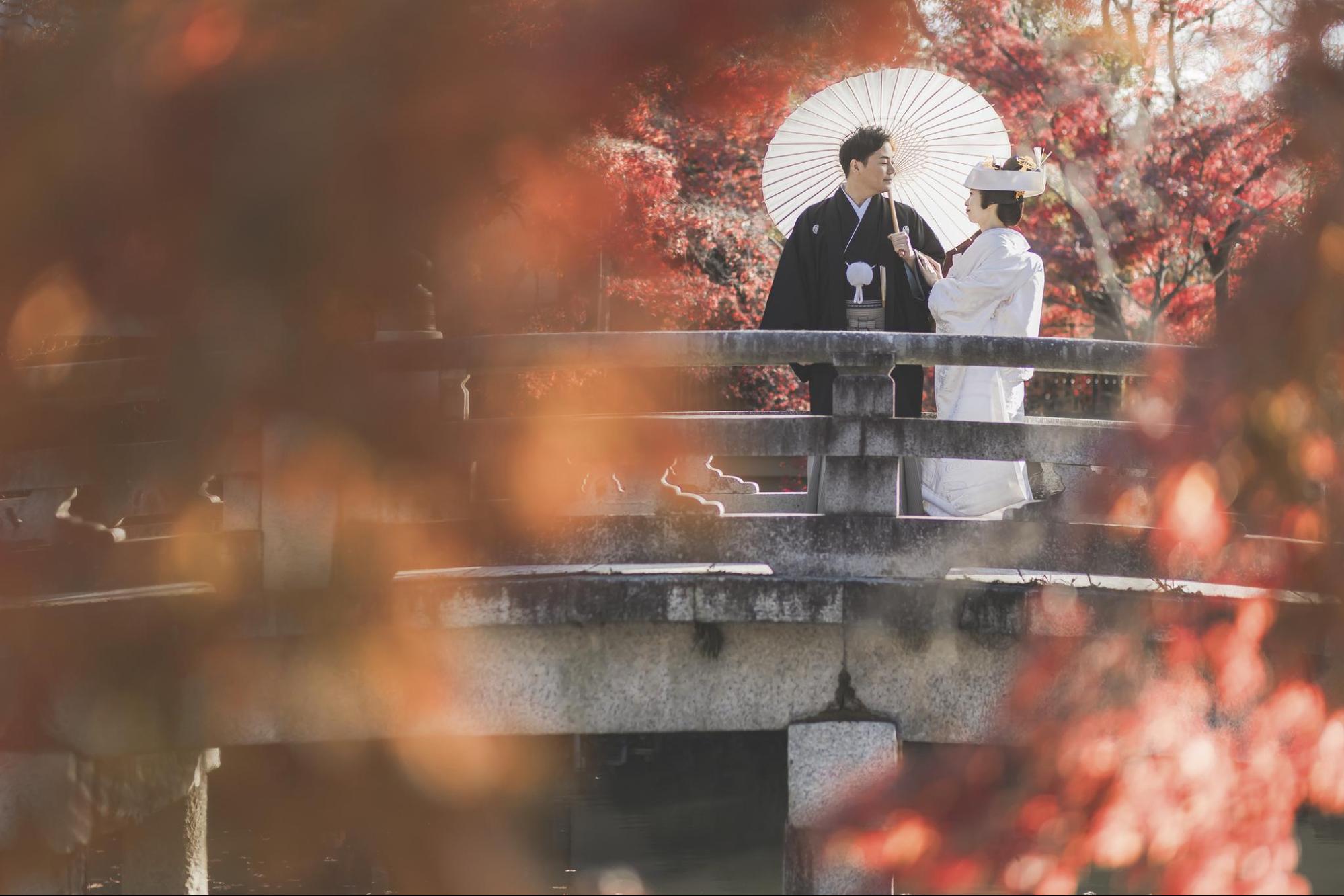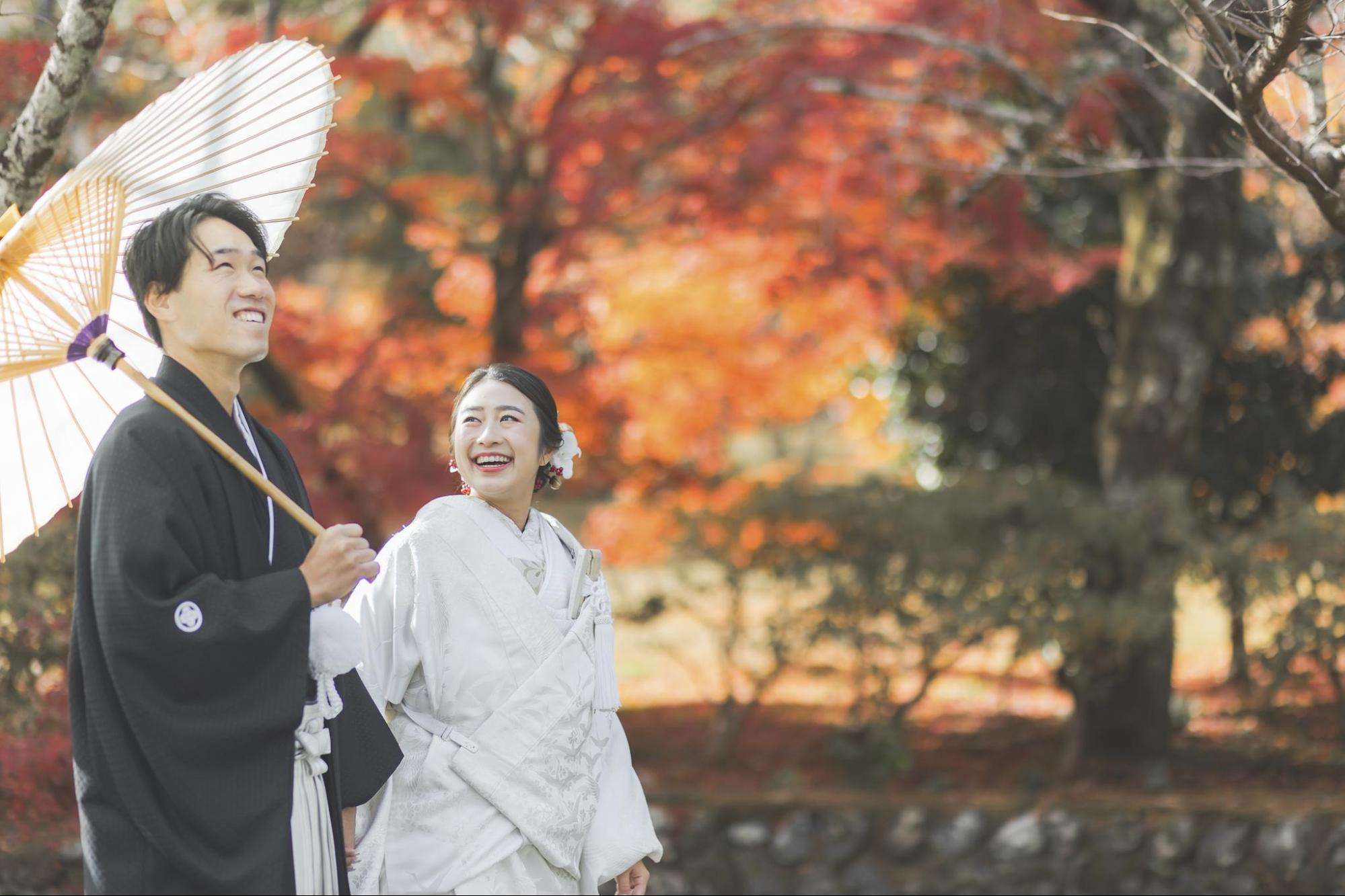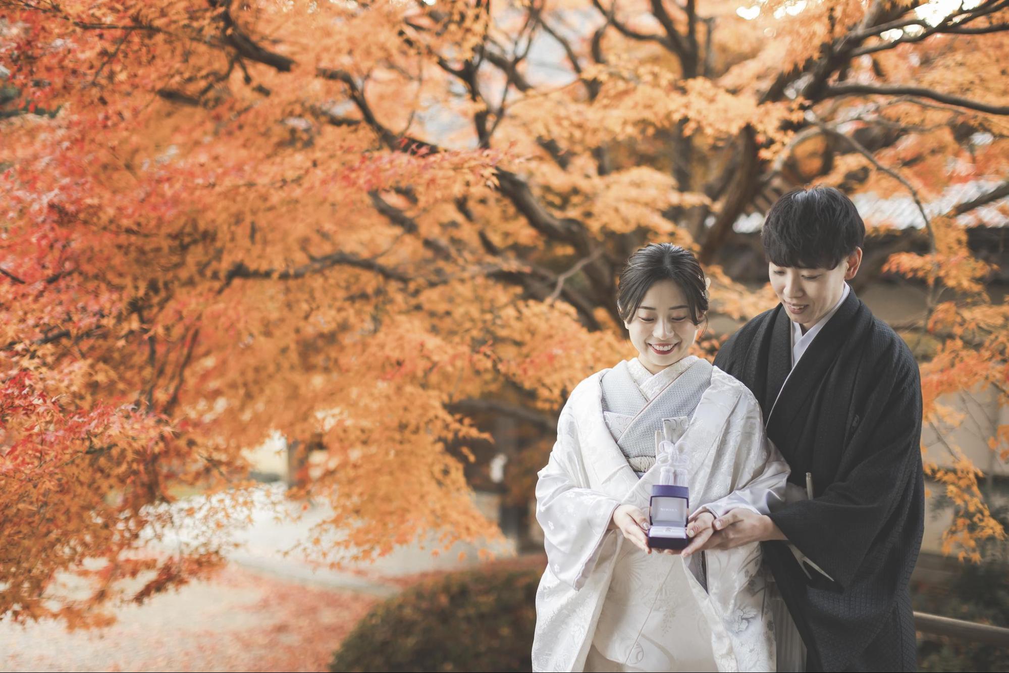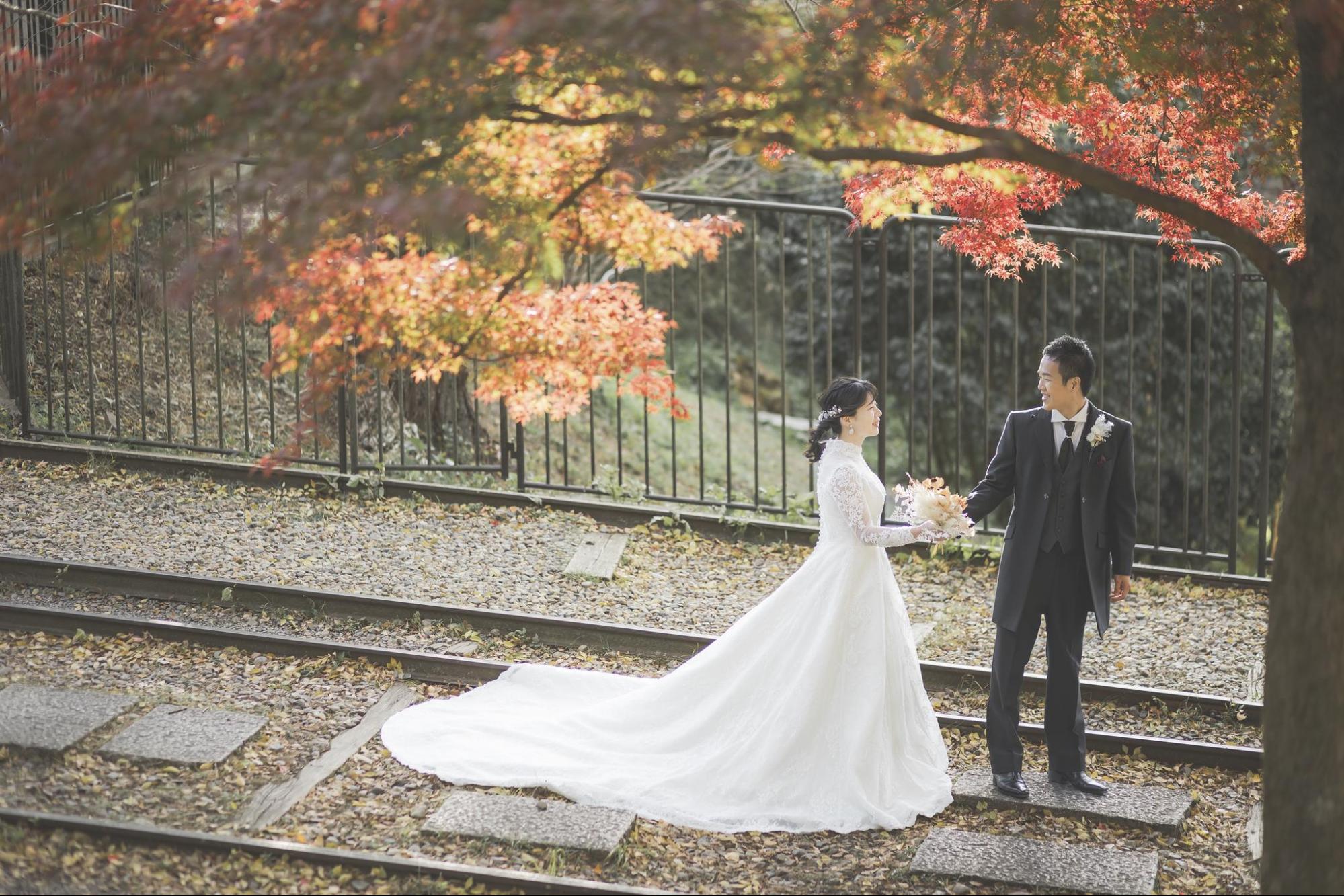 秋は紅葉がきれいで前撮りにぴったりの季節です。和装はもちろんのこと、洋装ともマッチして、素敵な写真を残せます。